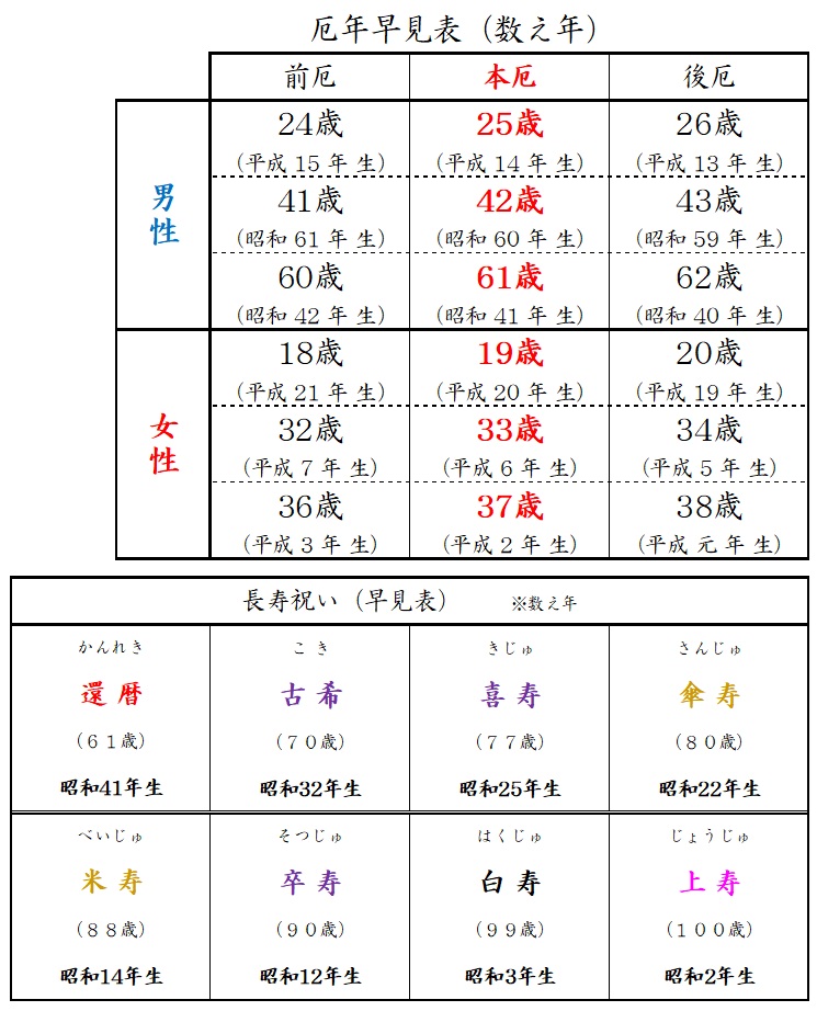 令和8年 厄年 並 長寿祝い早見表(数え年)